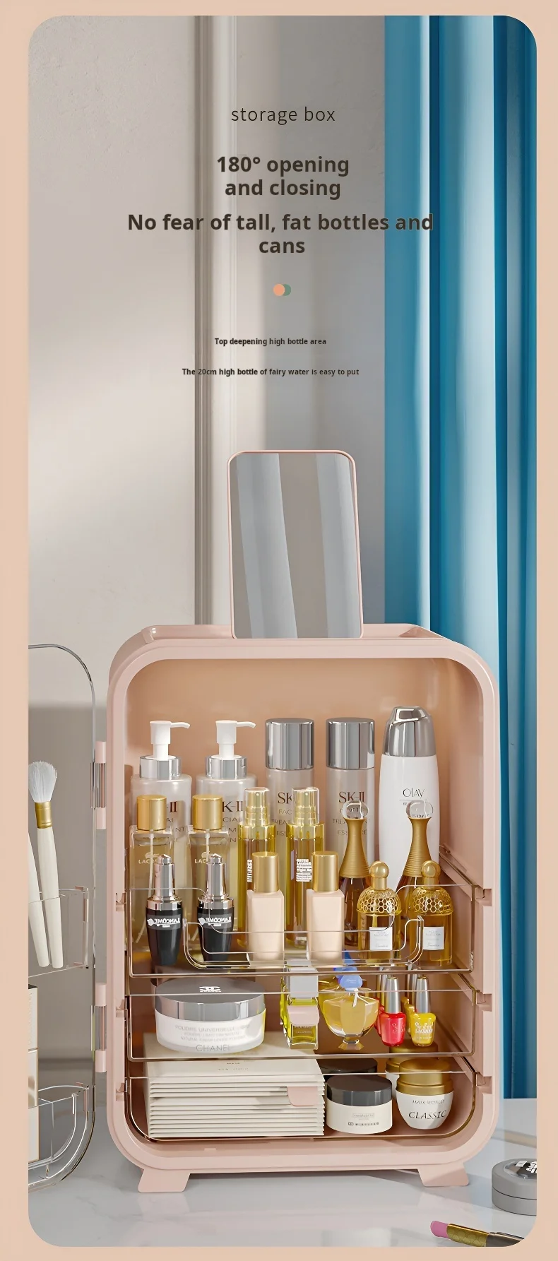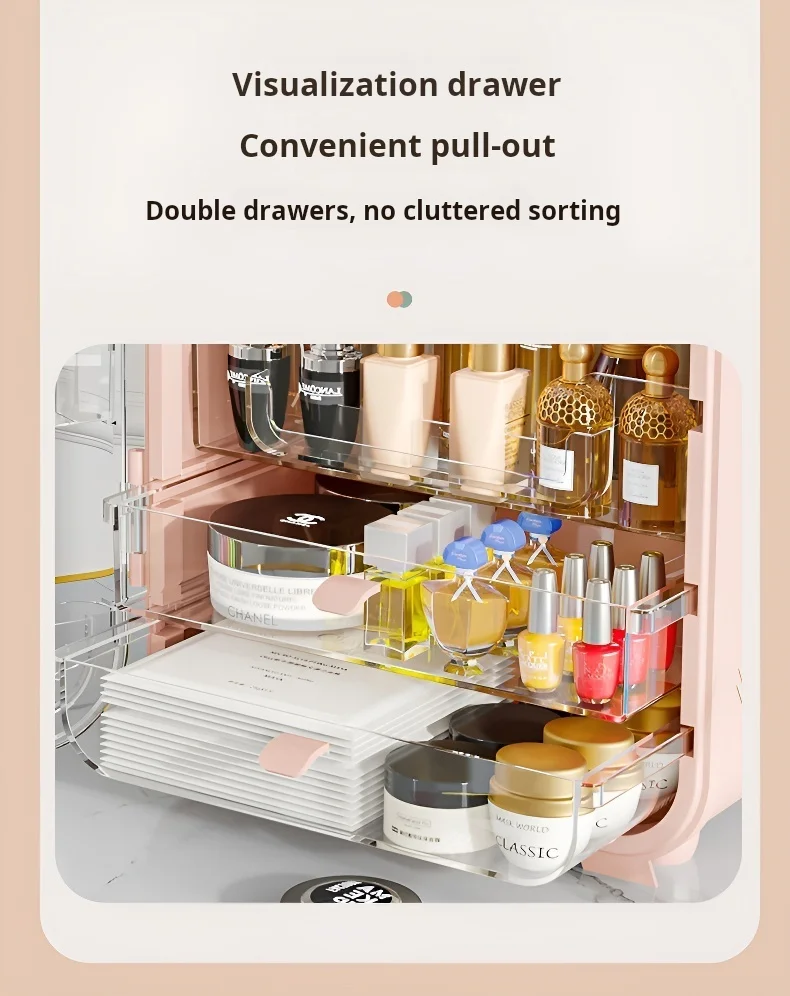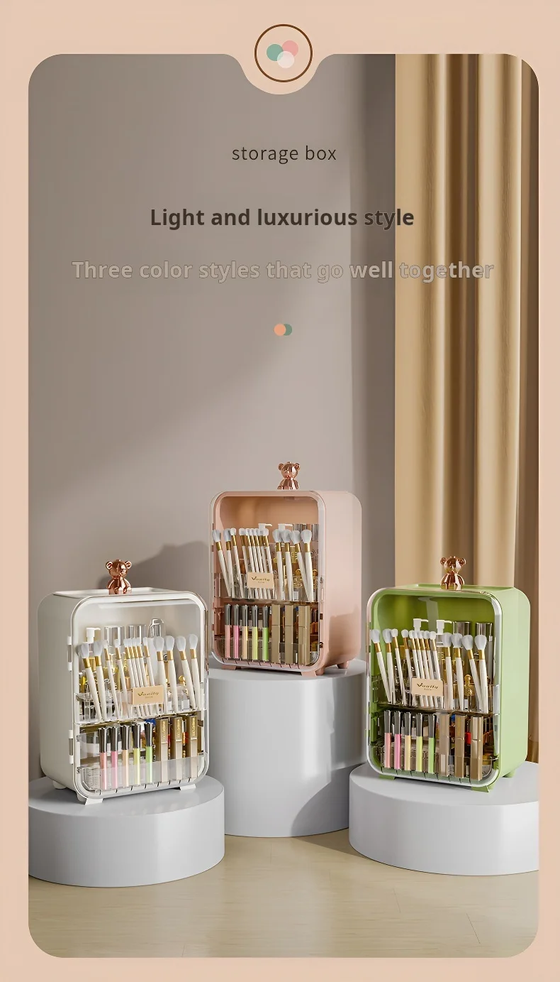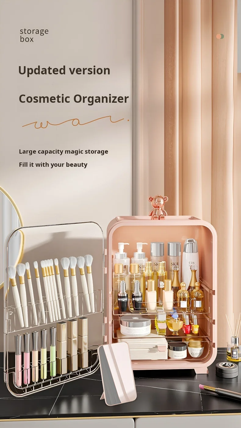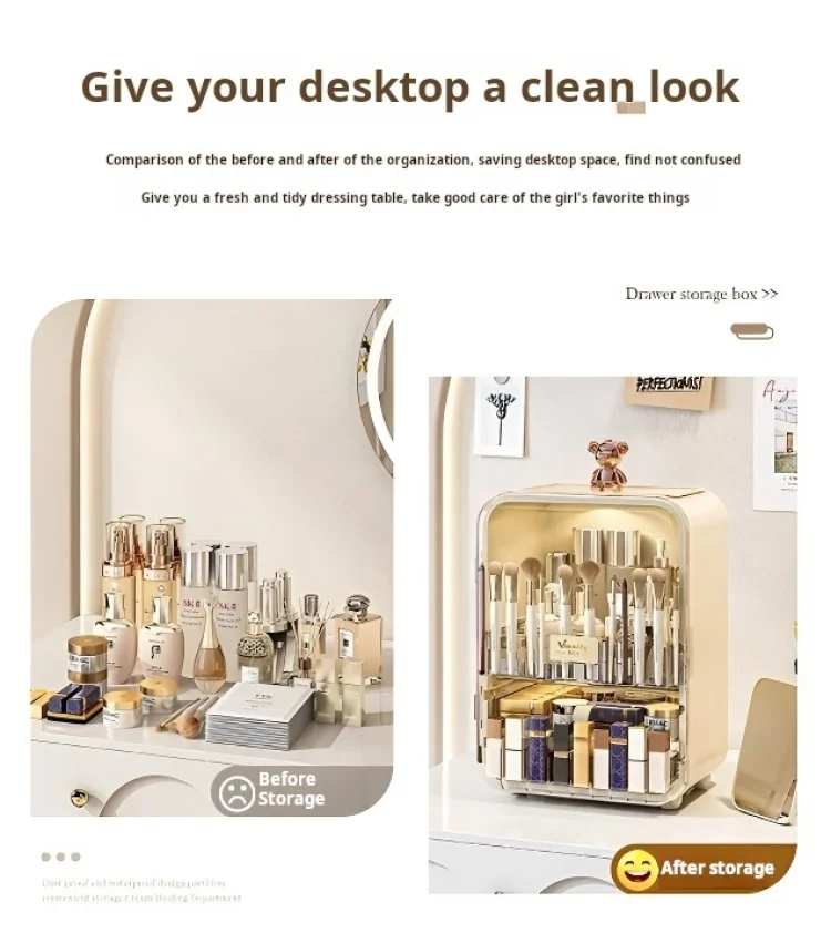 This high-capacity, dustproof desktop organizer keeps all your cosmetics, including lipsticks and skincare, neatly stored and easily accessible, adding an elegant touch to your vanity.
