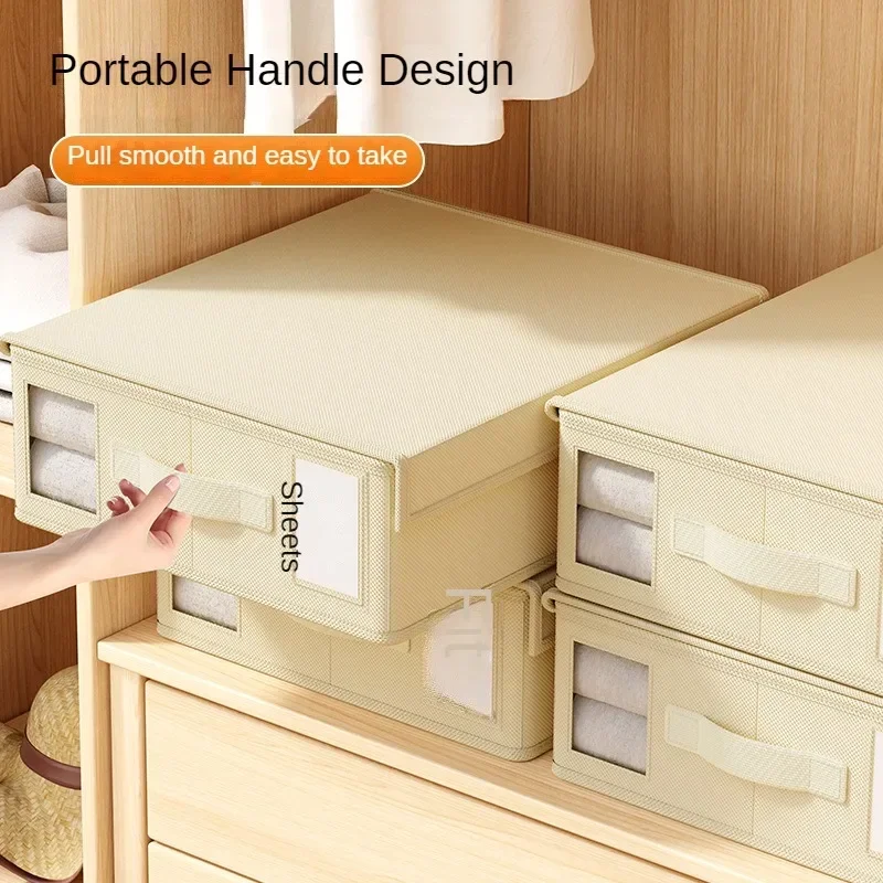 Short Description: A multi-purpose, large-capacity storage box designed to neatly organize bedding items like quilts and sheets, featuring a window for easy labeling and identification.