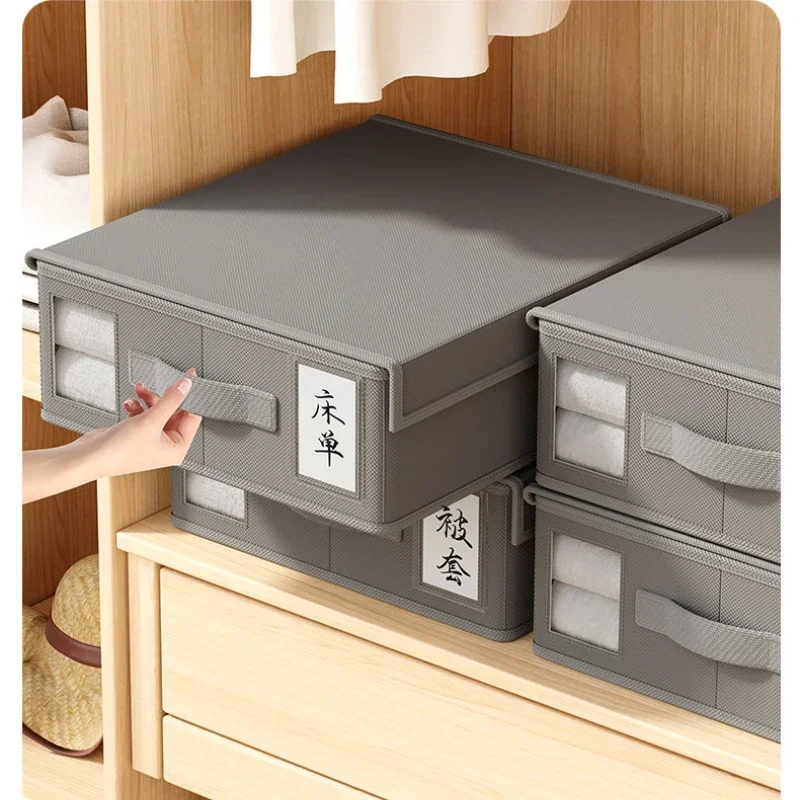 Short Description: A multi-purpose, large-capacity storage box designed to neatly organize bedding items like quilts and sheets, featuring a window for easy labeling and identification.