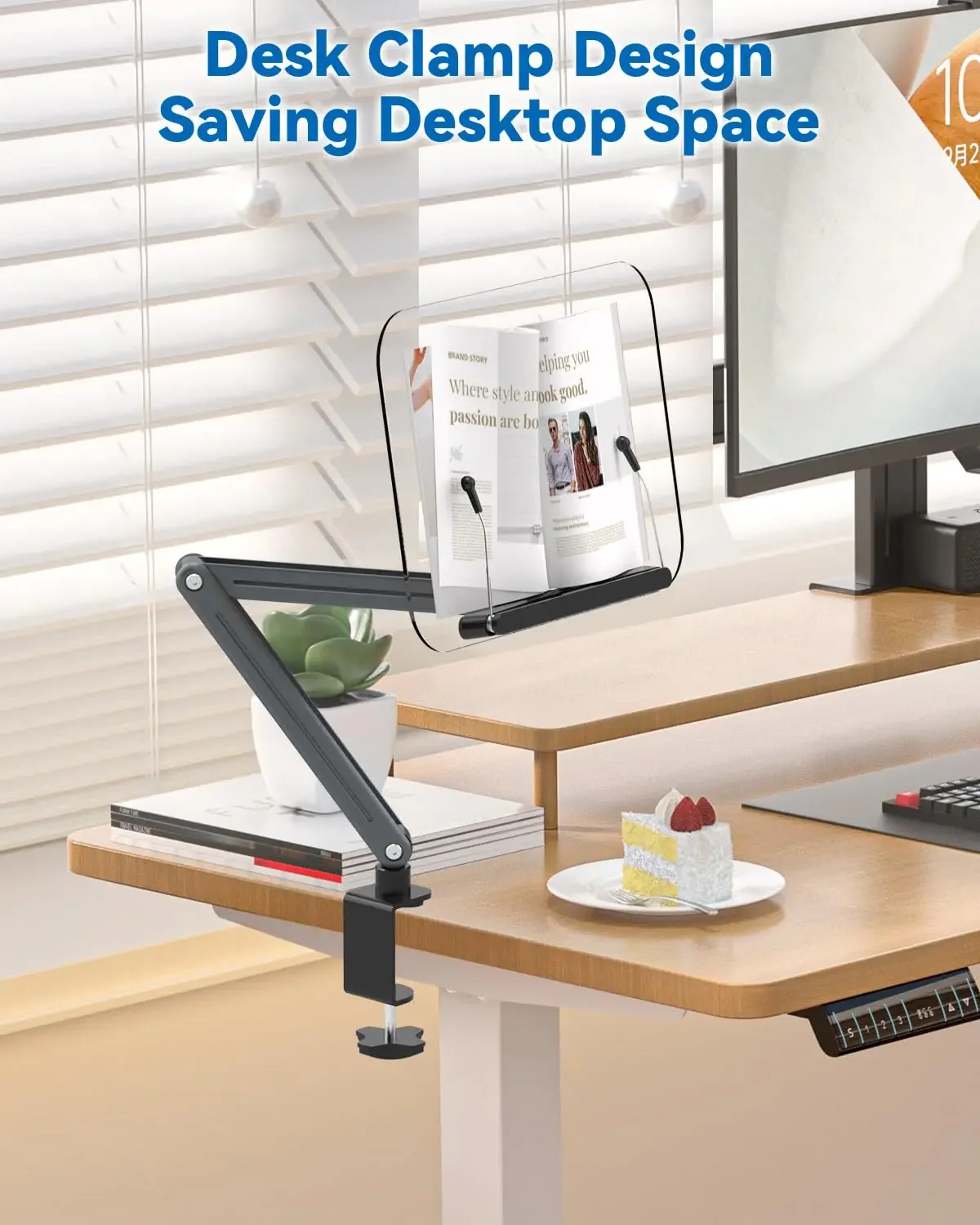 This adjustable, desk-clamping book stand features an ergonomic design and rotating base to provide a comfortable, hands-free reading experience for books, recipes, or tablets.