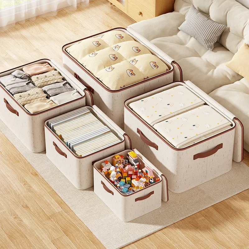 A durable, large-capacity storage box crafted from thick cotton linen, designed to organize quilts, clothes, pants, and sweaters within bedrooms, closets, or wardrobes.