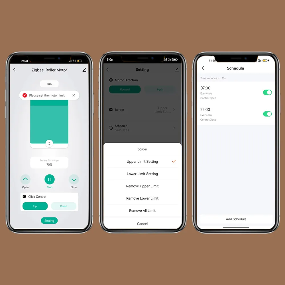 Electric rolloer blinds can support setting upper limit, middle limit, lower limit, achieve percentage control, do not have to stare at the window every time to see where it stay and worry