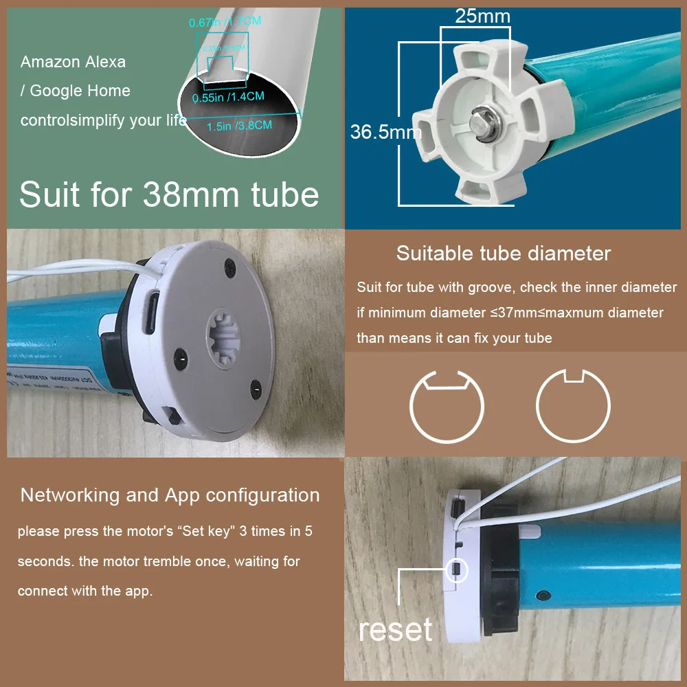 This tuya smart curtains roller blinds motor can be used for aluminum tubes with a diameter of 38MM. Please check whether the size of your aluminum tubes is the same as the size of the aluminum tubes below before placing the order, so as not to fit your aluminum tubes. Thank you!