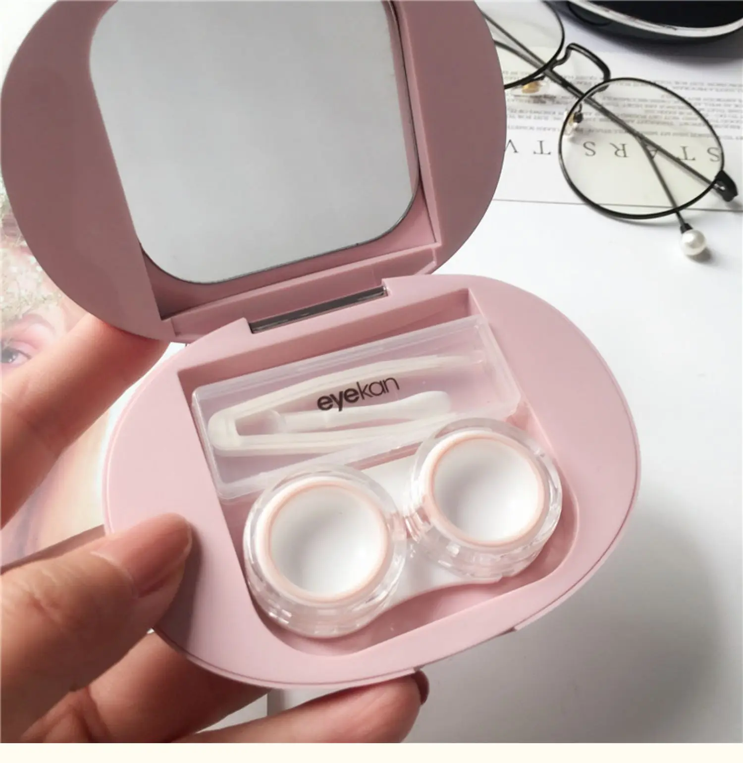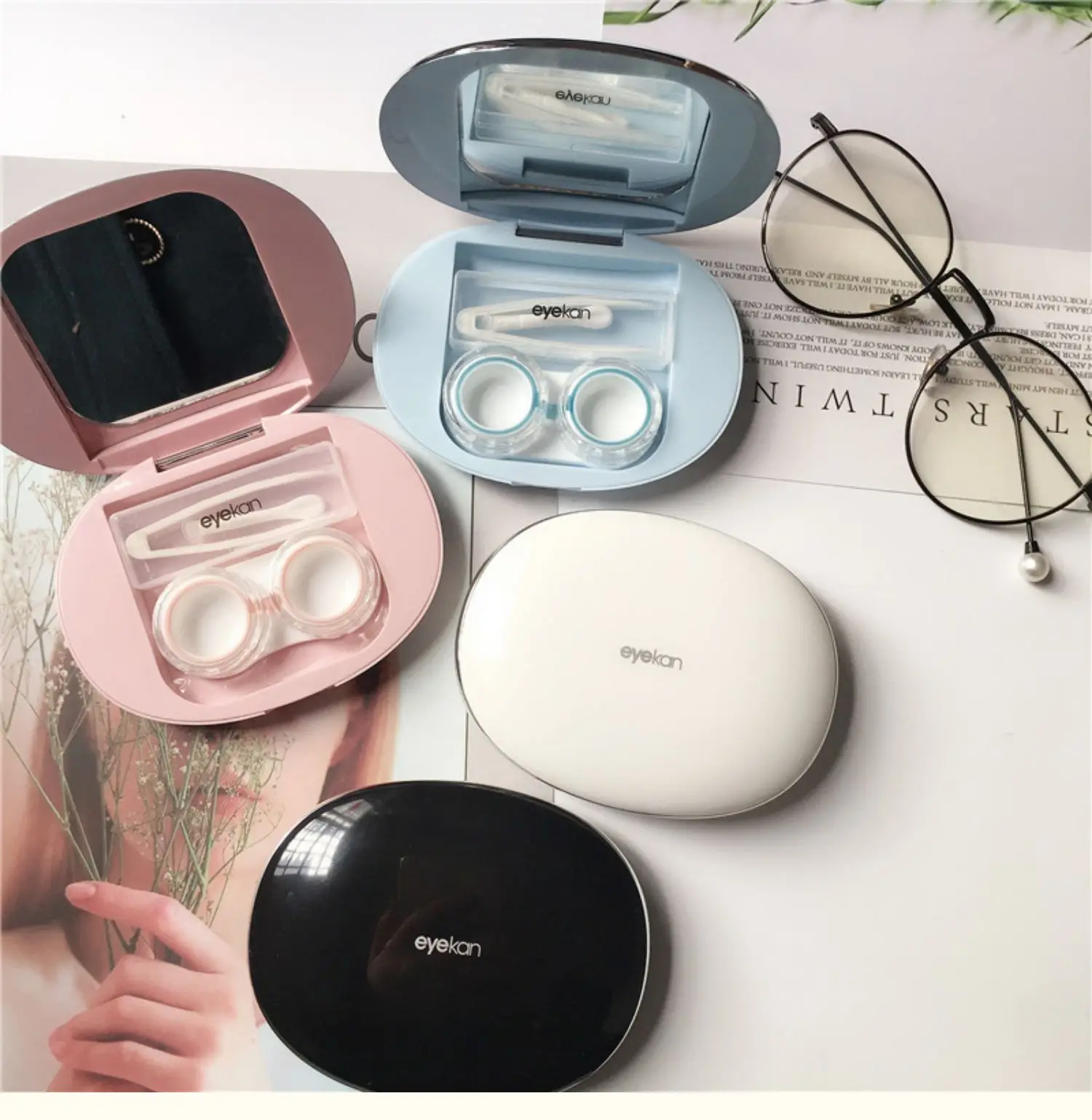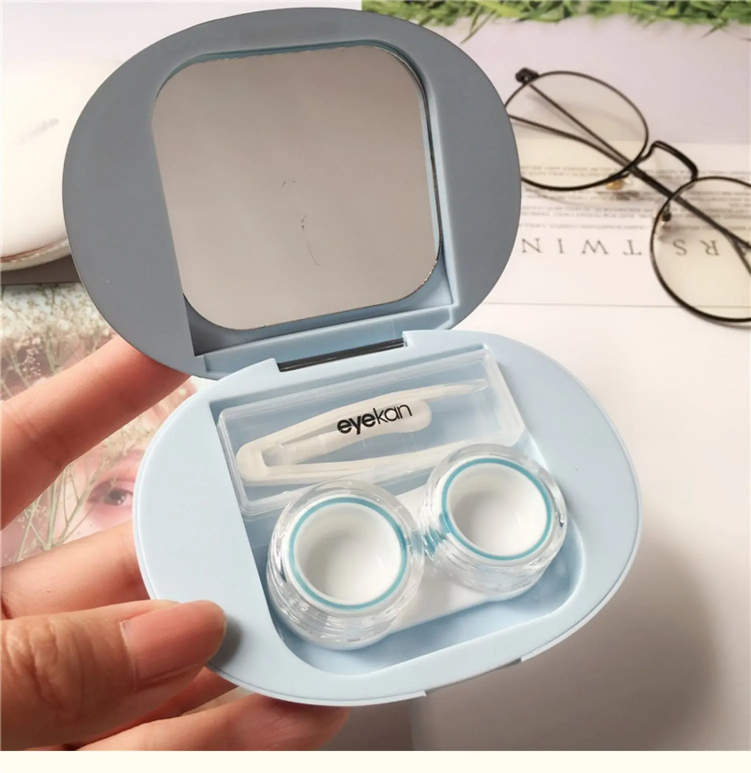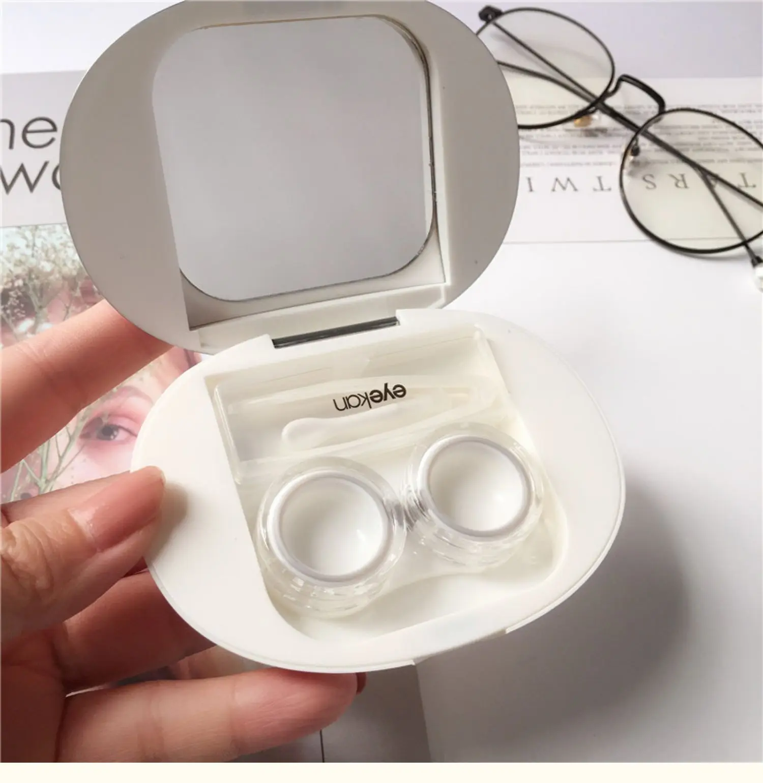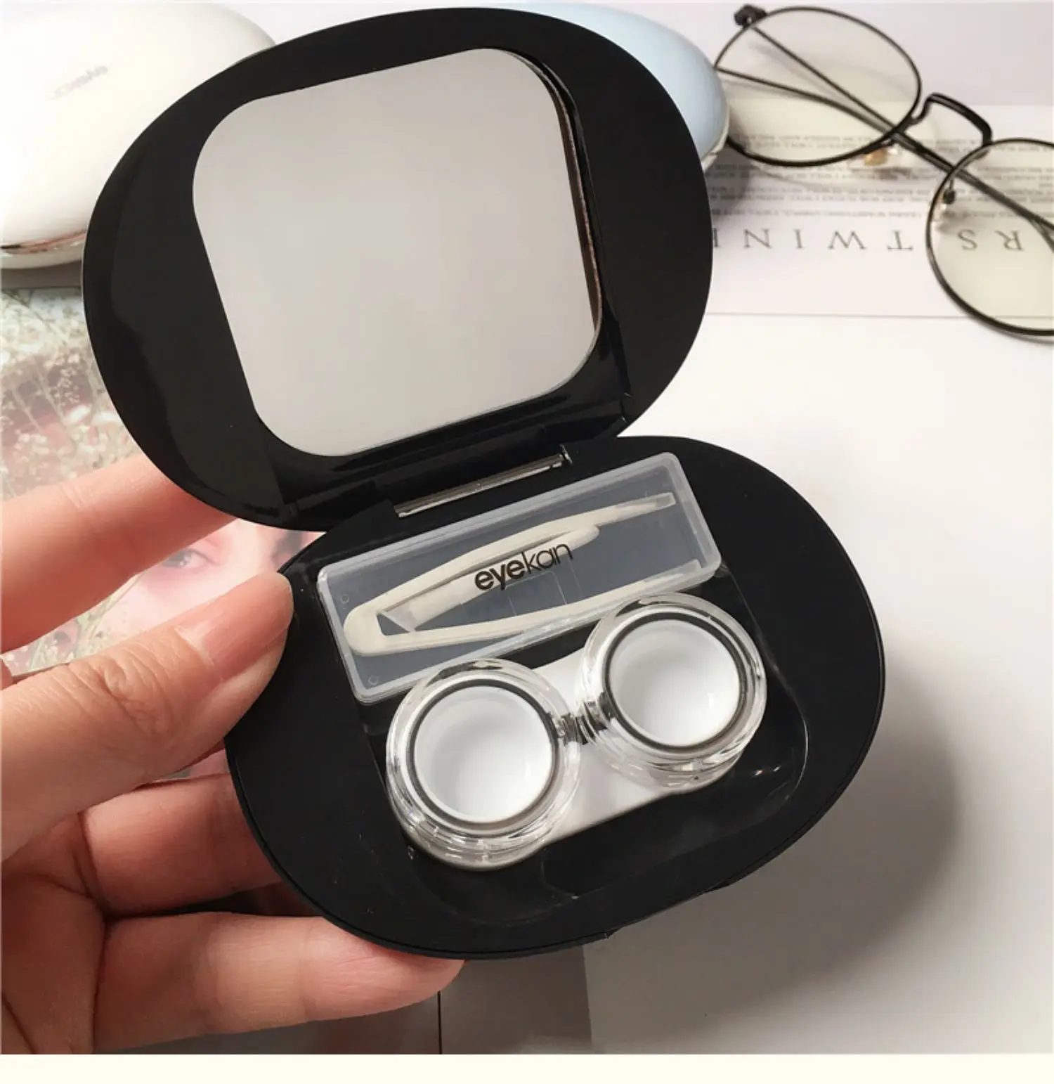 An elegant, ultra-thin contact lens case featuring magnetic attraction, a built-in mirror, and essential tools for easy and hygienic lens care on the go.